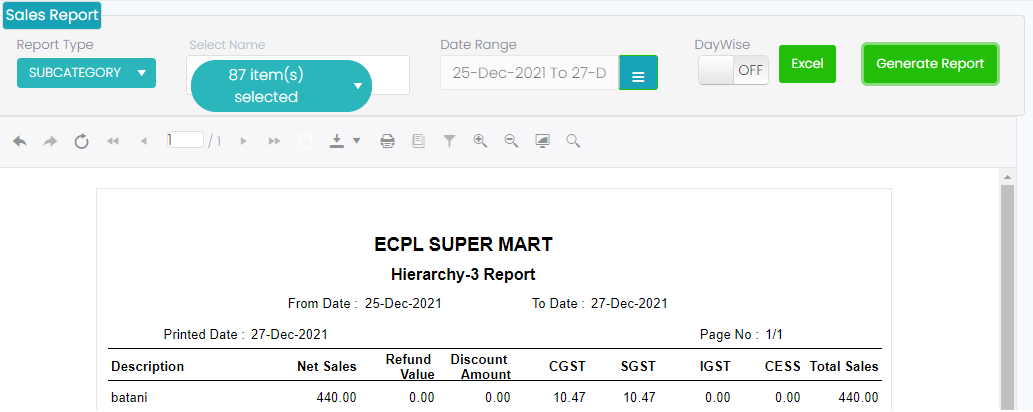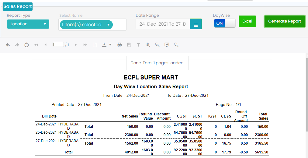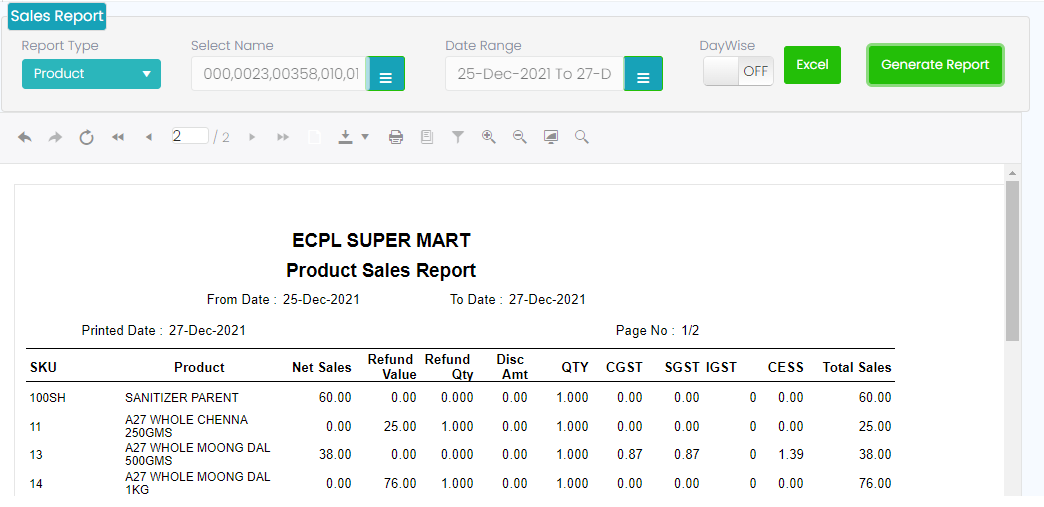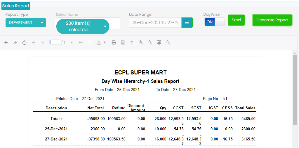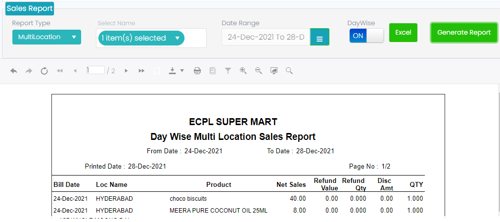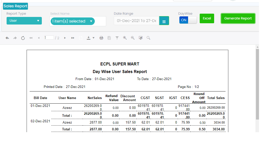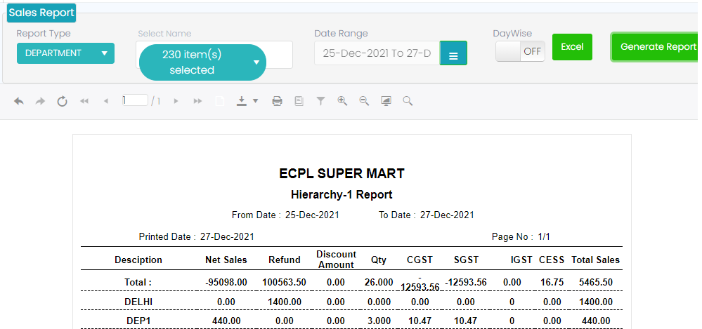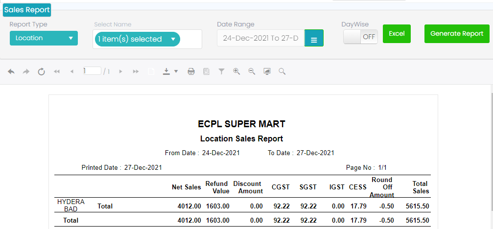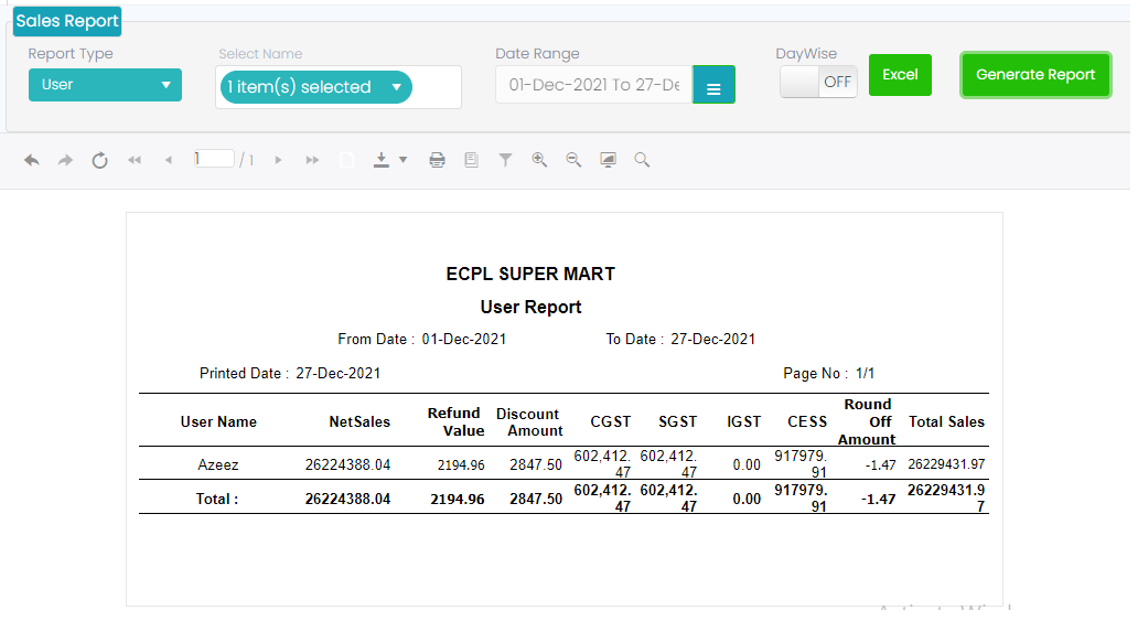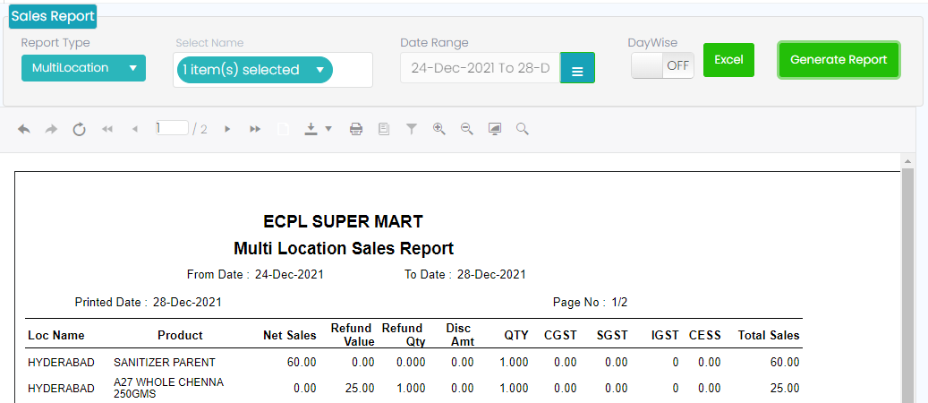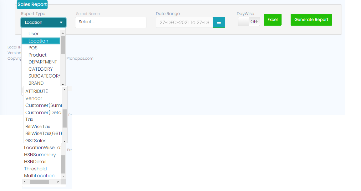 We can get the Sales Report based on the selected Report Type. We have seven Report Types i.e., User wise, Location Wise, POS wise, Product wise, Hierarchy-1(Department) wise, Hierarchy-2(Category) wise, Subcategory, Brand, Attribute, Vendor, Customer (Summary), Customer (Detail), Tax, Bill Wise Tax, Bill Wise Tax GSTR, GST Sales, Location wise Tax, HSN Summary, HSN Detail, Threshold, and Multi Location. After selecting the Report type select the respective individual, select the date range, Day wise ON/OFF and click on the ‘Generate Report’ or Excel button.
