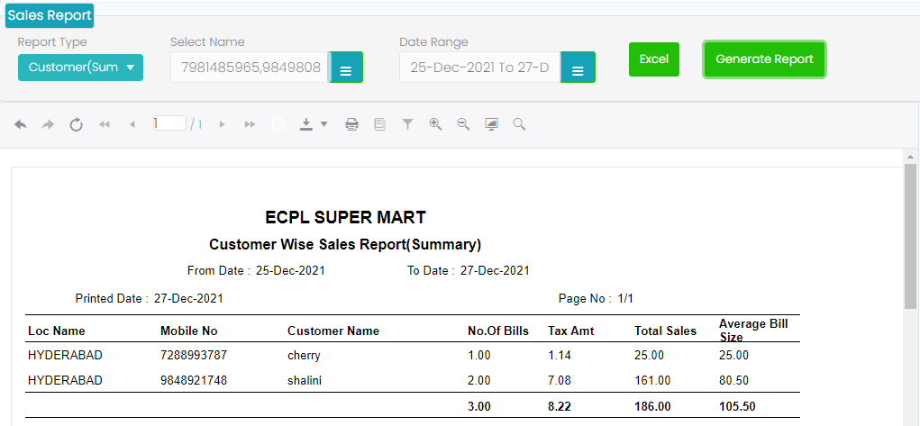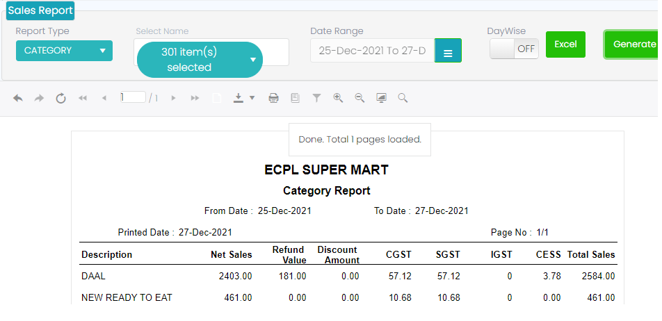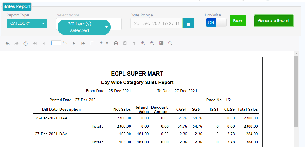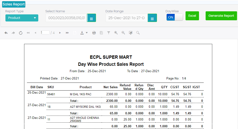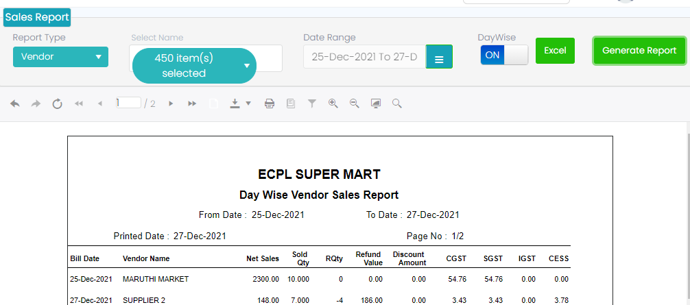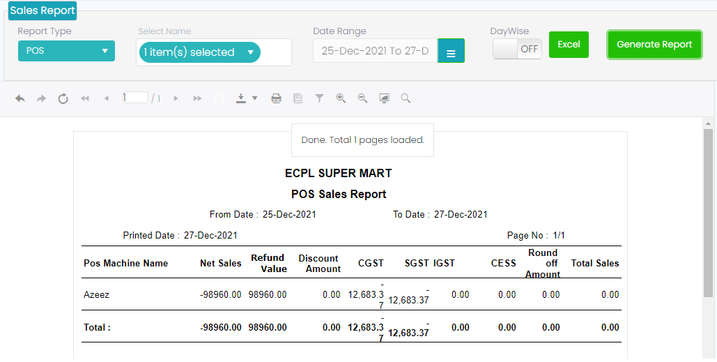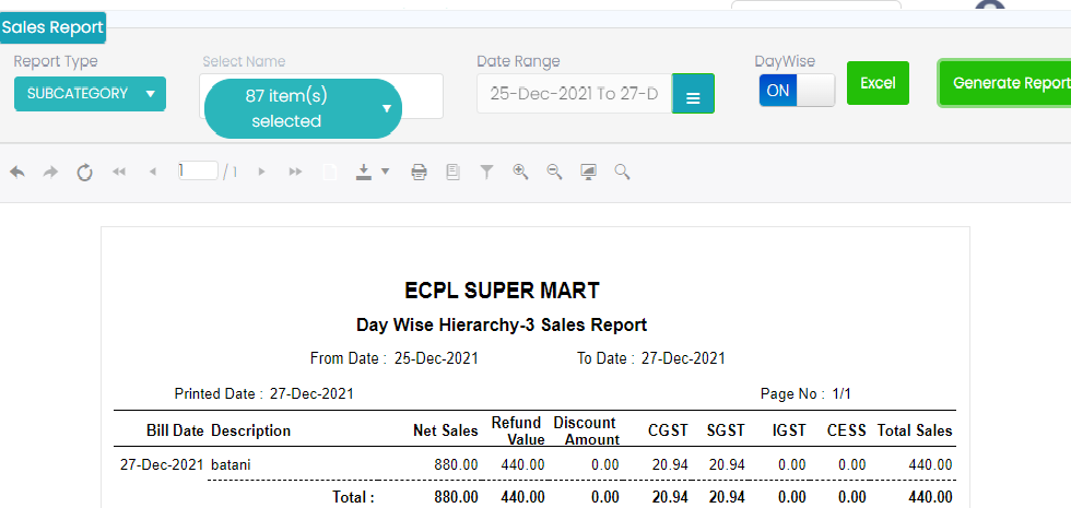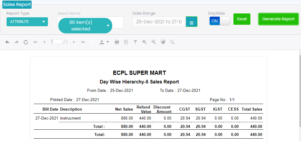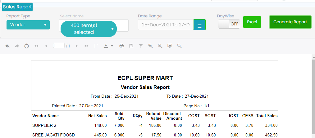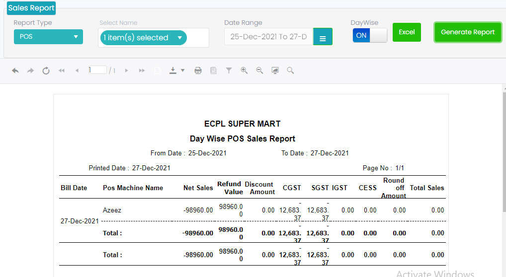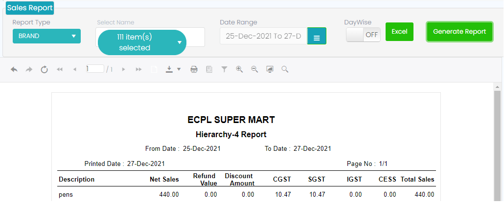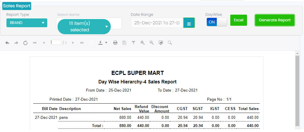 We can get the Sales Report based on the selected Report Type. We have seven Report Types i.e., User wise, Location Wise, POS wise, Product wise, Hierarchy-1(Department) wise, Hierarchy-2(Category) wise, Subcategory, Brand, Attribute, Vendor, Customer (Summary), Customer (Detail), Tax, Bill Wise Tax, Bill Wise Tax GSTR, GST Sales, Location wise Tax, HSN Summary, HSN Detail, Threshold, and Multi Location. After selecting the Report type select the respective individual, select the date range, Day wise ON/OFF and click on the ‘Generate Report’ or Excel button.
