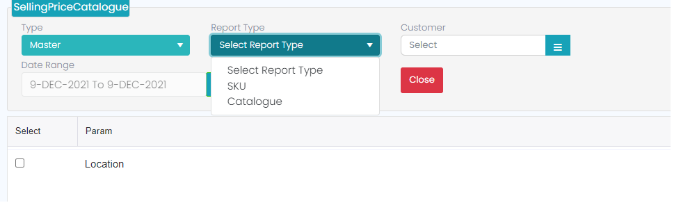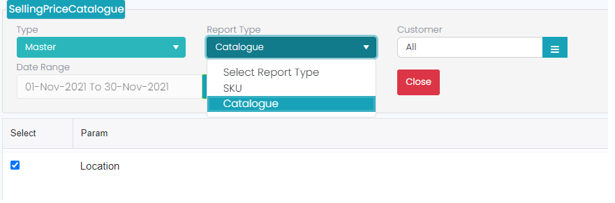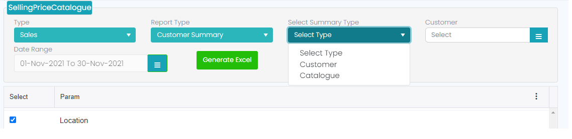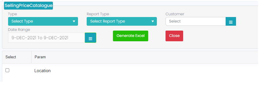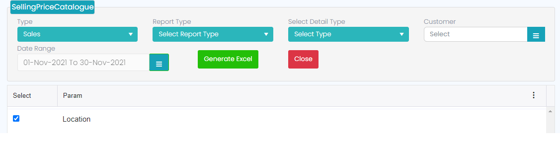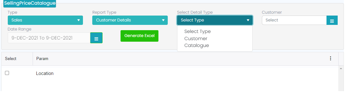 When user clicks on that module leads to new screen with Type as (Masters & Sales report), Report type as (SKU and Catalogue), Customer Selection, Date Range, generate excel, close button and the parameters.