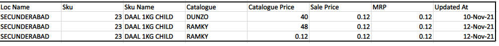 After Generated Report in Excel it will display the Column names as Loc Name, SKU Code, SKU Name, Catalogue, Catalogue Price, Sale price, MRP, Updated At as shown in below screenshot