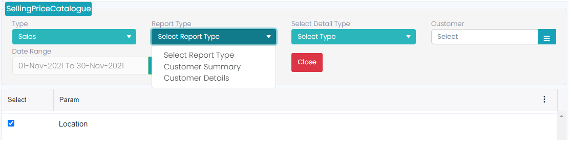 Select Type as Sales-> Report Types as Customer Detail>Select Detail Type as Customer (or)Catalogue ->Selection parameter Location then generate Report as shown in below screenshot.