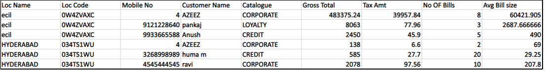 After Generated Report in Excel it will display the Column names as Loc Name, Loc Code, Mobile No, Customer Name, Catalogue, Gross Total, Tax Amount, No. Of Bills, Avg Bill Size as shown in below screenshot