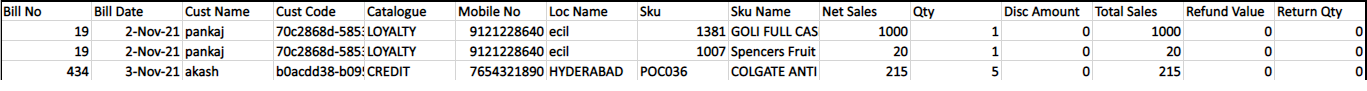 After Generated Report in Excel it will display the Column names as Bill No, Bill Date, Cust Name, Cust Code, Catalogue, Mobile No, Loc Name, SKU, SKU Name, Net Sales, Qty, Disc Amount, Total Sales, Refund Value and Return Qty as shown in below screenshot
