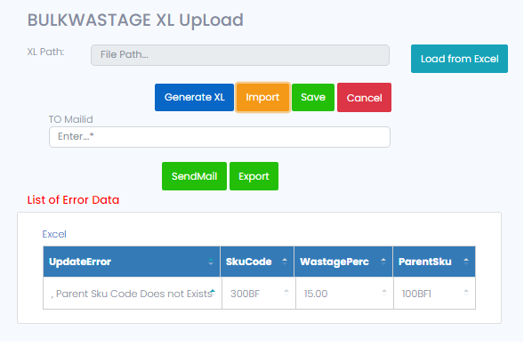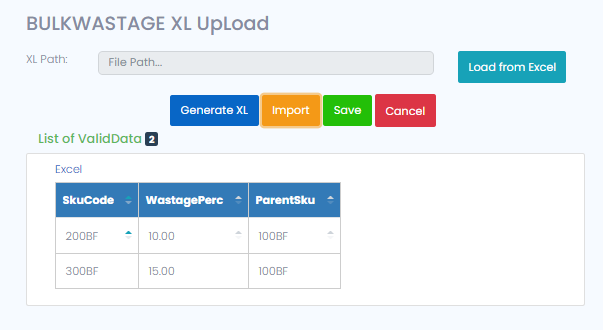 For Bulk Wastage XL upload, click on ‘Bulk Wastage’ to upload the Bulk Wastage masters through excel.