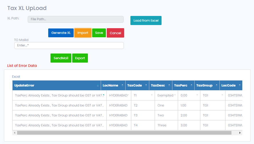If any duplicate data or invalid data found in the excel, then it shows the list of error data which we can send to a mail by giving a mail id at ‘To Mail ID’ and clicking on ‘Send Mail’ button, we can also export this error data in the excel as well.