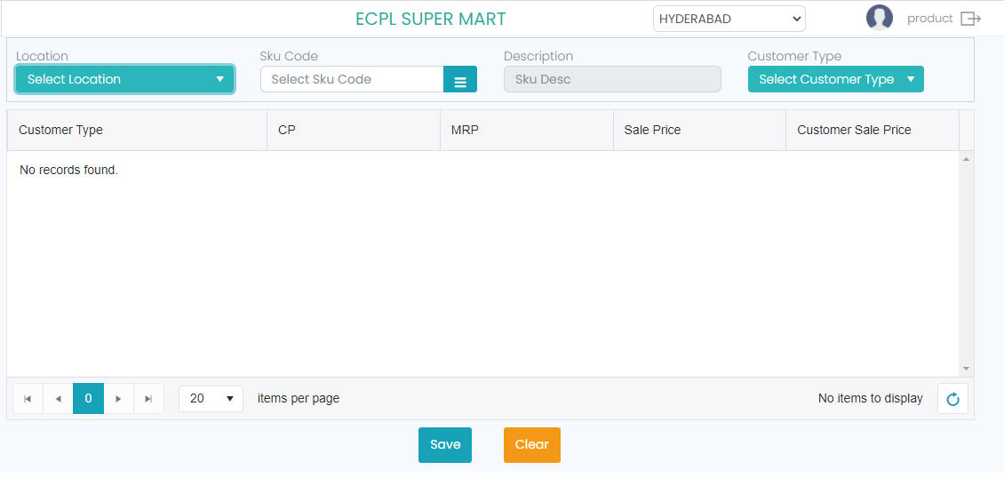 Once we select the single or multiple customer types at once it should show the selected customer types’ details in the grid. The grid should have the columns of ‘Customer Type’, ‘CP’, ‘MRP’, ‘Sale Price’, and ‘Customer Type Sale Price’.