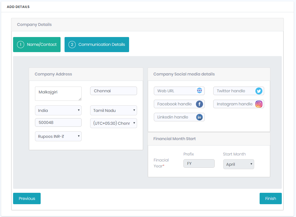 In Communication Details, we can enter address details and social media details.