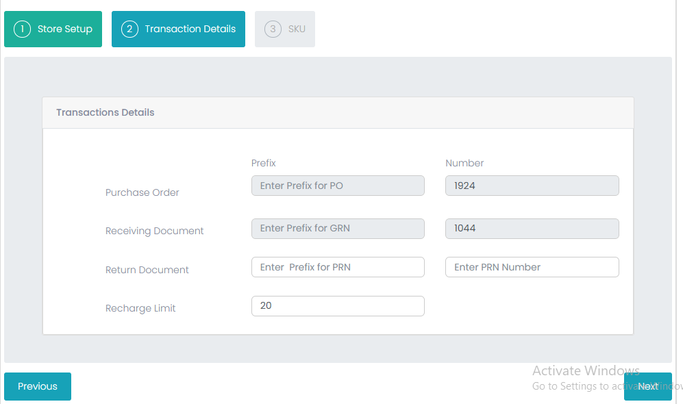 Enter the Transactional Details need to enter Purchase Order, Receiving Document, Return Document, Recharge Limit and click on Finish button to save the updated Store details.