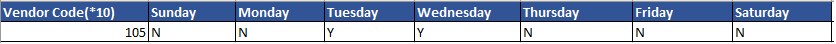 The Excel Sheet should contain: Vendor code, Sunday, Monday, Tuesday, Wednesday, Thursday, Friday, Saturday.