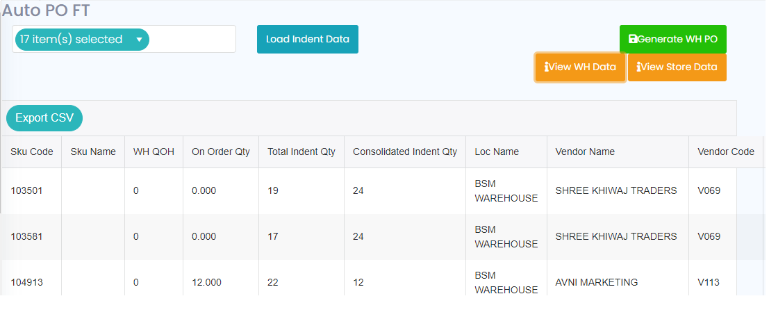 Export CSV: Export to CSV option is provided to user to download the loaded data in the grid for both loaded indent and PO