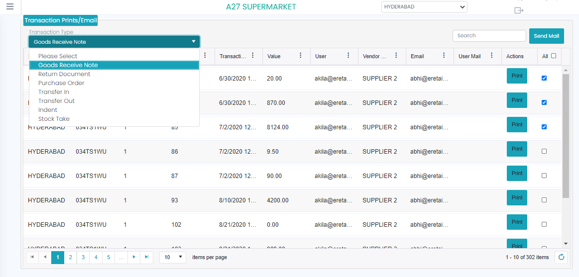 After selecting this option at menu bar, it will lead to new screen, where we need to select transaction type, select the transaction number. From here to print the transaction details click on the ‘Send Mail’ button to send the same to respective mail ids. Print will work individual transaction wise.