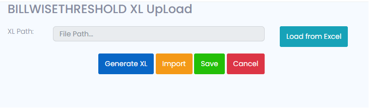 After Selecting the Bill Wise threshold, leads to new screen with XL Path, Load from Excel, Generate Xl, Import, Save and Cancel.