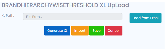 After Selecting the Bill Wise Brand Hierarchy threshold XL Upload, leads to new screen with XL Path, Load from Excel, Generate Xl, Import, Save and Cancel.